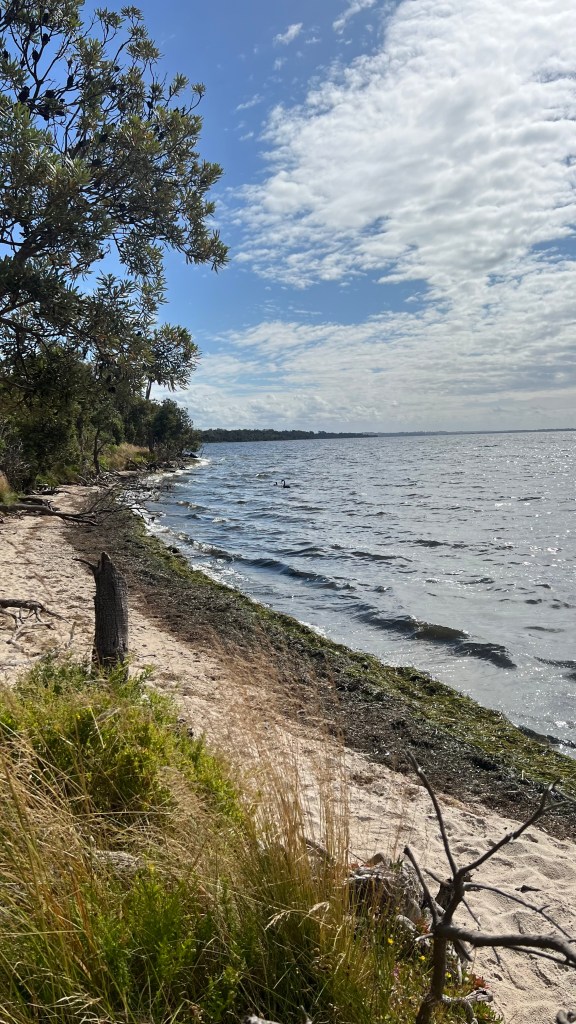 Our next stop was Friendly Beach and Christina was pleased to try her new car on a gravel track. By now it was lunchtime, so we enjoyed sandwiches on a bench overlooking the bay, entertained by a kite-surfer.