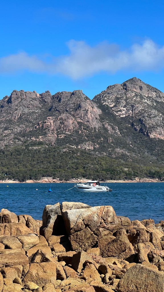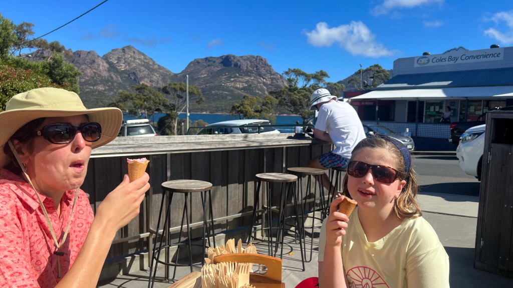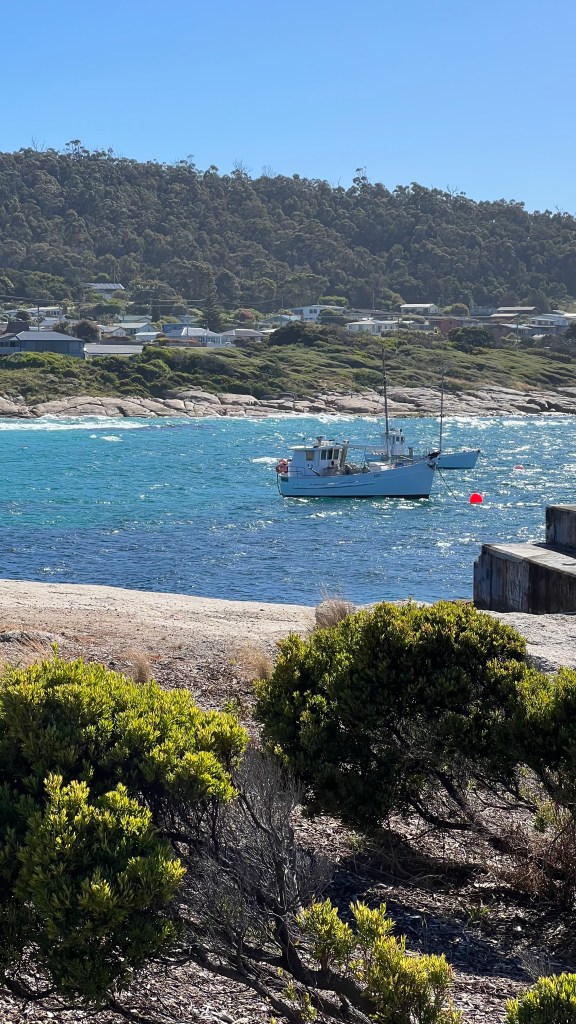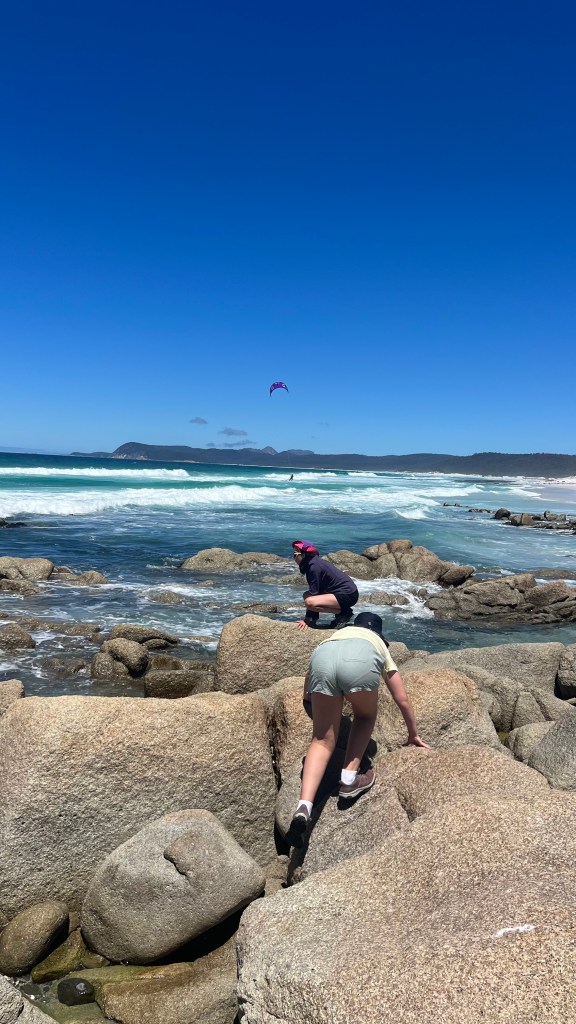 By now we were getting hungry and so found a fish and chip shop in Bicheno and enjoyed our whiting, scallops and calamari outside in the sun. we then had a little explore around Bicheno. We watched an Air Ambulance land in the school field. Apparently there had been a car crash a little way down the road.